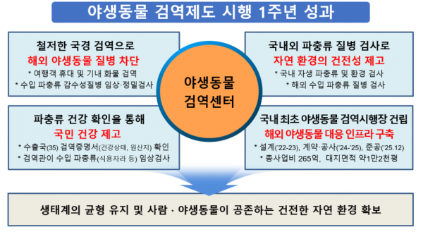 수출국 검역 기관이 발행한 검역증명서 등 서류 확인과 수입 동물에 대한 야생동물검역관의 임상검사를 거친 야생동물만 국내로 반입되도록 해 해외 야생동물 유래 질병 차단 및 국민 건강성 확보에 기여했다.
