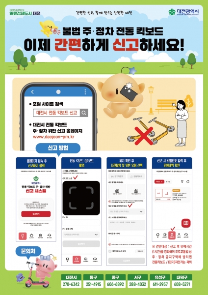신고는 포털 사이트에서 ‘대전시 전동킥보드 신고’로 검색하거나, 대전광역시 전동킥보드 주·정차 위반 신고시스템 홈페이지에 접속해 간편하게 접수할 수 있다.