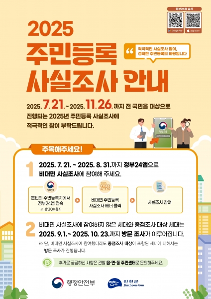 주민등록 사실조사는 오는 8월 31일까지 정부24를 통해 비대면-디지털 조사를 먼저 진행하고 비대면 조사에 참여하지 않은 주민과 중점 조사 대상은 오는 9월 1일부터 10월 23일까지 이장과 담당 공무원이 방문 조사를 진행할 예정이다.