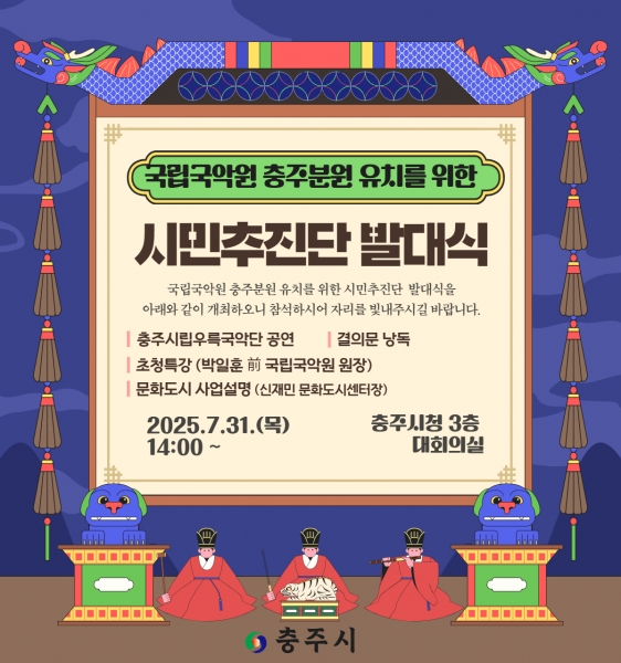 시는 오는 31일 오후 2시 충주시청 3층 대회의실에서 ‘국립국악원 충주분원 유치를 위한 시민추진단’ 발대식을 개최하고 국악 콘텐츠 허브도시 도약에 총력을 기울일 계획이다.