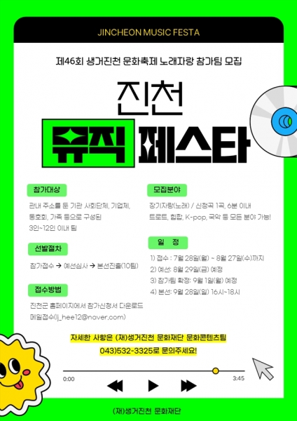 [세종타임즈] 생거진천문화재단은 전 연령층이 함께 즐기는 문화교류의 장을 만들기 위해 ‘진천 뮤직페스타’에 참여할 팀을 7월 28일부터 8월 27일까지 모집한다.