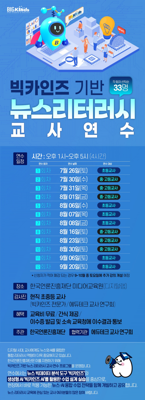 아울러 7월부터 9월까지 언론재단 미디어연구원에서는 ‘빅카인즈 기반 뉴스 리터러시 교사 연수’를 총 12회 진행한다.