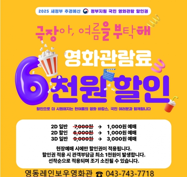 정영철 영동군수는 “무더위에 지친 군민들께서 시원한 영화관에서 저렴하게 문화생활도 즐기고 휴식도 누리시길 바란다”며 “앞으로도 군민의 문화 향유 기회를 넓히고 지역 문화시설 활성화를 위한 다양한 정책을 꾸준히 추진하겠다”고 밝혔다.