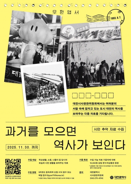 전일홍 대전시 문화예술관광국장은 “시민 여러분의 소중한 추억이 대전의 살아있는 역사가 된다”며 “기록을 통해 기억을 보존하고 함께 공유할 수 있도록 많은 관심과 참여를 바란다”고 말했다.