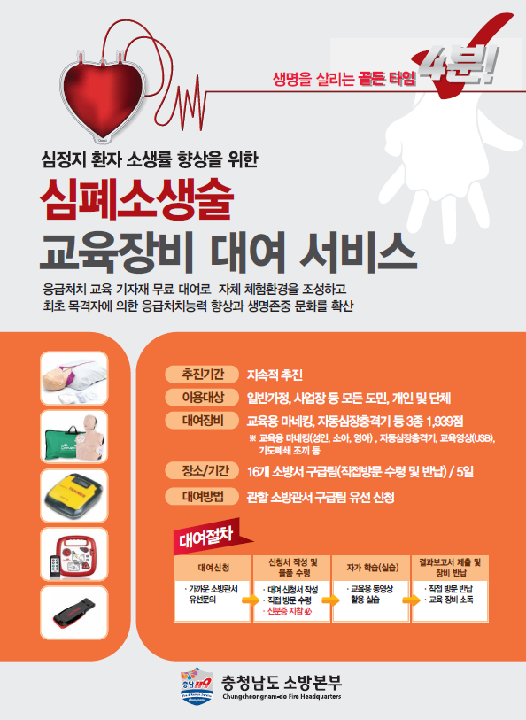 [세종타임즈] 충남 공주소방서는 심정지 환자의 초기 대응 능력을 높이고 생명존중 문화를 확산하기 위해 ‘심폐소생술 교육장비 대여 서비스’를 운영하고 있다고 밝혔다.