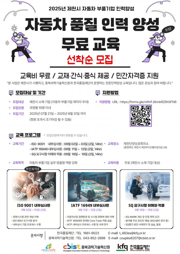 모집 대상은 제천시 관내 자동차 부품기업 재직자이며 과정별로 15명 이내 선착순 접수로 진행된다.