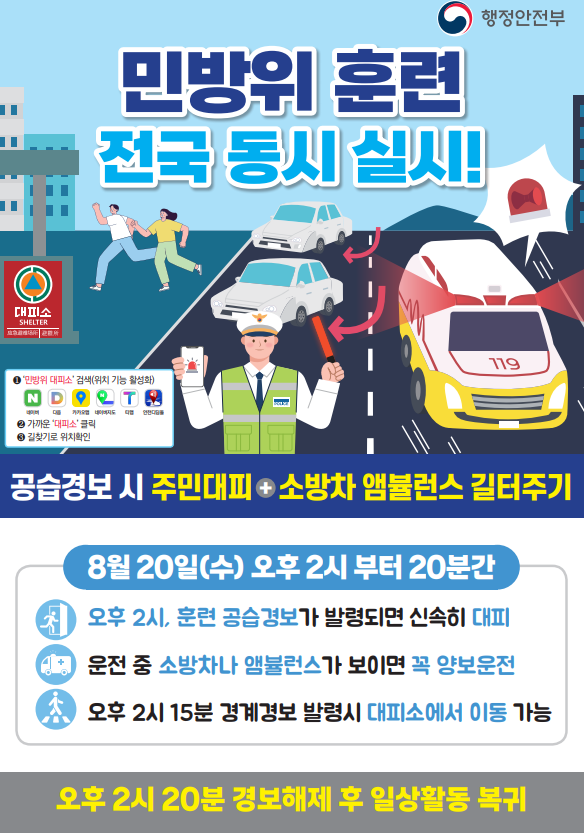 [세종타임즈] 소방청은 2025년 을지연습과 민방위 훈련을 연계해, 오는 8월 20일 오후 2시 전국 각지에서 일제히 ‘소방차 길 터주기 훈련’을 실시한다고 밝혔다.