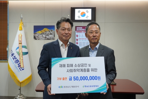 조소행 충남재단 이사장은 “기록적인 폭우로 어려움을 겪고 있는 도내 중소기업과 소상공인에게 충남개발공사의 기부금이 큰 힘이 될 것”이라고 밝히며 “전달받은 기부금으로 재해피해기업 특례보증을 신속하게 지원하고 사회취약계층의 금융 비용 부담을 덜어드릴 수 있도록 최선을 다하겠다”고 말했다.