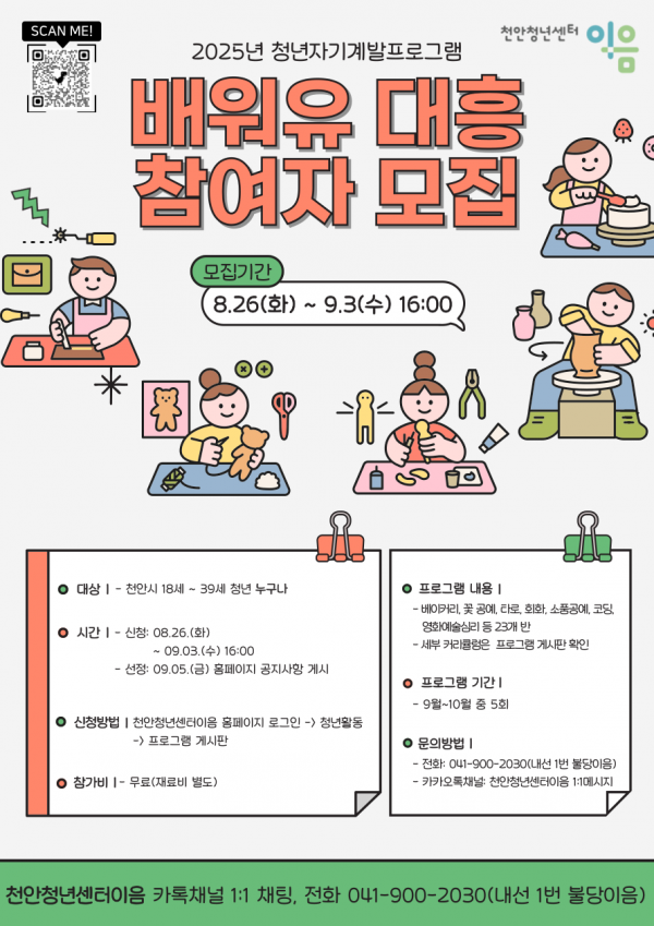 [세종타임즈] 천안시는 다음 달 3일까지 청년 자기계발프로그램 ‘배워유’ 참여자를 모집한다고 28일 밝혔다.