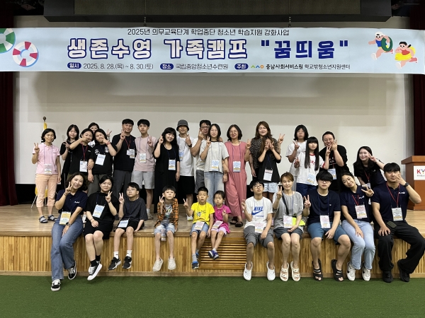 [세종타임즈] 충남사회서비스원 학교밖청소년지원센터에서 오는 8월 28일부터 8월 30일까지, 국립중앙청소년수련원에서 저연령 학교 밖 청소년 및 꿈이음 청소년을 대상으로 한 생존수영 가족캠프 ‘꿈띄움’을 운영한다고 밝혔다.