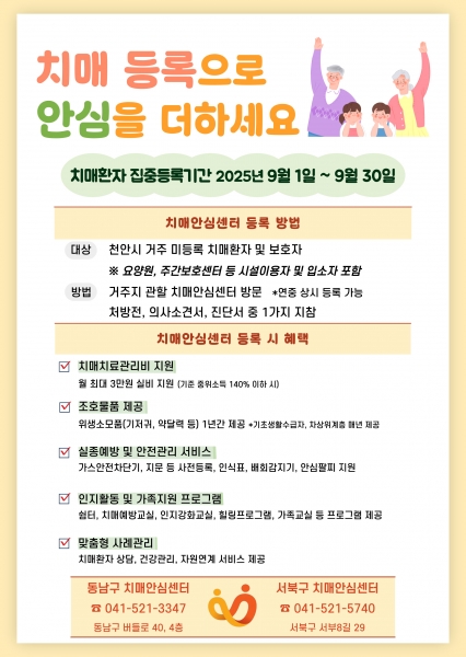 문의 사항은 동남구 치매안심센터, 서북구 치매안심센터로 하면 된다.