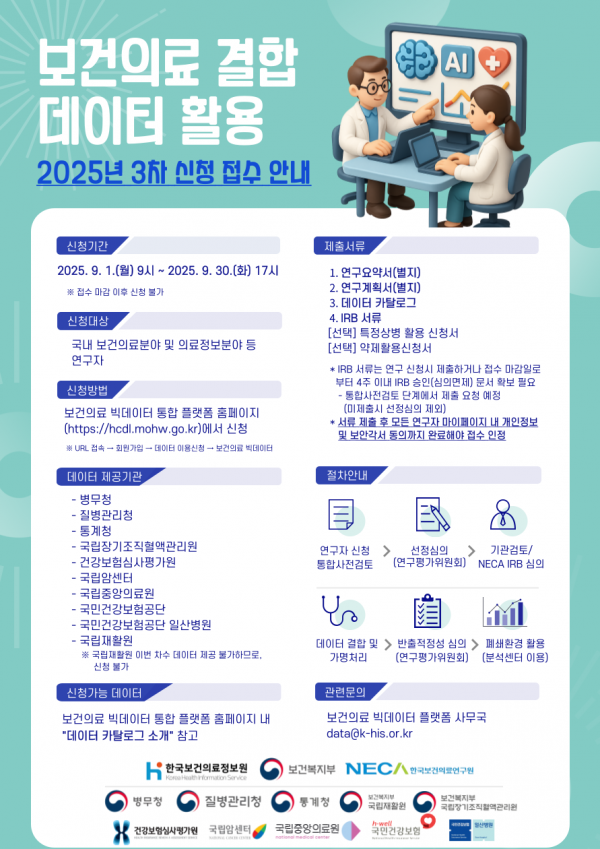 아울러 한국보건의료정보원과 한국보건의료연구원은 9월 1일부터 9월 30일까지 보건의료 빅데이터 플랫폼을 통한 2025년 제3차 보건의료 결합 데이터 활용 신청을 접수한다.