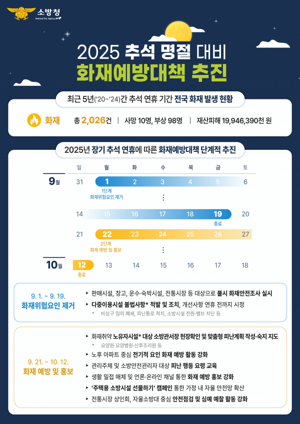 홍영근 소방청 화재예방국장은 “올해 추석 연휴는 최장 10일로 어느 때보다 화재 위험이 높다”며 “최근 5년간 연휴 기간 화재 원인 중 부주의가 45.7%를 차지한 만큼, 국민 여러분께서 생활 속에서 작은 안전수칙만 지켜도 큰 피해를 예방할 수 있다 특히 주거시설과 전통시장에서의 안전 관리에 적극 동참해 달라”고 당부했다.