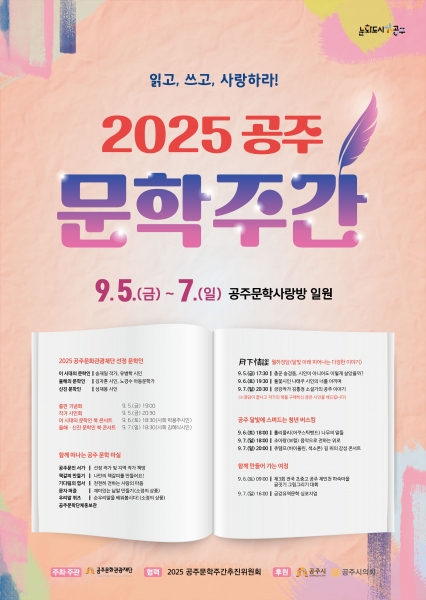 행사 첫날인 9월 5일 오후 7시에는 “2025 공주 문학인 출판사업”에 선정된 공주지역 문학인의 출판기념회가 열릴 예정이다.