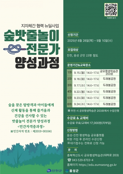 함수석 군 평생학습센터 주무관은 “숲 밧줄 놀이는 단순한 놀이를 넘어 아이들의 상상력과 창의력, 협동심을 키우는 소중한 교육 자원”이라며 “이번 교육과정을 위해 유익하고 다양한 프로그램을 준비했으니 많은 분의 관심과 참여를 부탁드린다”고 말했다.
