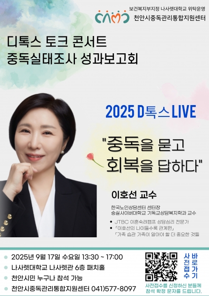 토크콘서트에는 이호선 교수가 나서 ‘중독을 묻고 회복을 답하다’를 주제로 중독문제의 본질과 회복 가능성에 대해 시민들과 소통할 예정이다.