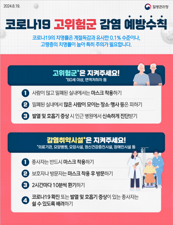 임승관 질병관리청장은 “코로나19 확산세가 아직까지 지속되고 있다”며 “고령층의 어르신이나 면역저하자 등 고위험군은, 사람이 많이 모이는 실내 행사 참여를 자제해 주시고 참여 시에는 마스크를 착용해 코로나19를 예방하시길 바란다”고 당부하고 “또한 발열 및 호흡기 증상 발생 시에는 신속히 병원을 방문해 적절한 진단 및 치료를 받아야한다”고 강조했다.