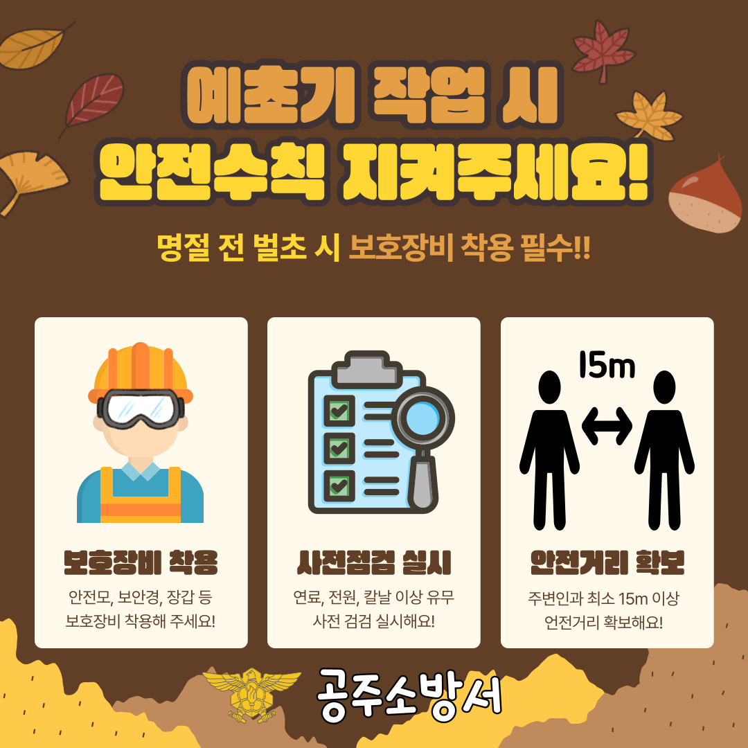 오긍환 공주소방서장은 “벌초는 조상을 기리는 소중한 전통이지만, 자칫 방심하면 평생 후유증을 남기는 사고로 이어질 수 있다”며 “모든 작업 시 보호장비를 착용하고, 안전수칙을 철저히 지켜 건강하고 안전한 명절을 보내시기 바란다”고 말했다.