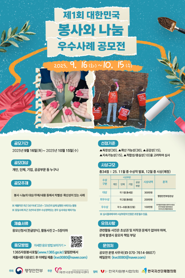 [세종타임즈] 행정안전부는 9월 16일부터 10월 15일까지 ‘제1회 대한민국 봉사와 나눔 우수사례 공모전’을 개최한다.