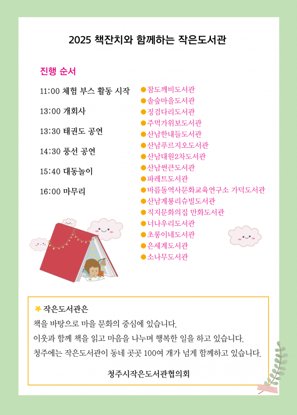 [세종타임즈] 청주시작은도서관협의회가 주관하고 청주시가 후원하는 2025 청주시 작은도서관 책잔치가 오는 27일 오전 11시부터 오후 4시까지 분평동 원마루공원에서 열린다.
