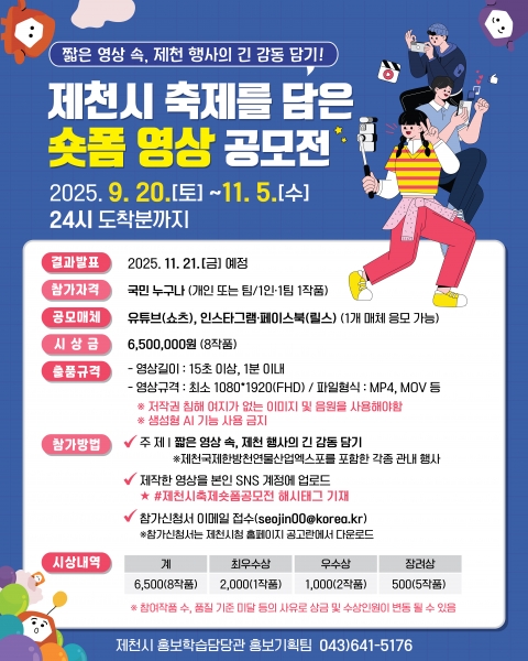 김창규 제천시장은 “이번 공모전은 제천시민은 물론 전국 누구나 제천의 다채로운 축제를 자신만의 시선으로 담아낼 수 있는 소중한 기회”며 “제천 축제의 생생한 순간을 담은 숏폼 콘텐츠가 제천의 매력과 감동을 널리 알리는 계기가 되길 바란다”고 전했다.