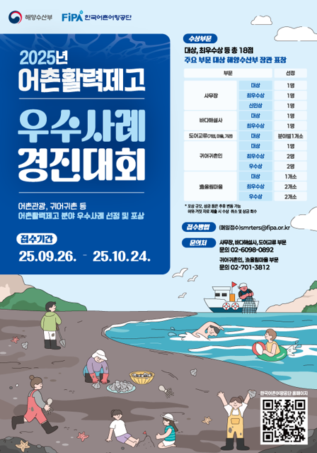 [세종타임즈] 해양수산부와 한국어촌어항공단은 어촌관광과 귀어귀촌에서 성과를 창출한 사례를 발굴하기 위해 ‘2025년 어촌활력 제고 우수사례’ 공모를 시행한다.