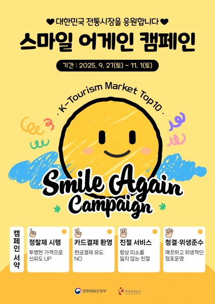 [세종타임즈] 문화체육관광부와 한국관광공사는 전국 전통시장에 활기를 불어넣고자 오는 27일부터 11월 1일까지 ‘2025 스마일 어게인 캠페인’을 전개한다.