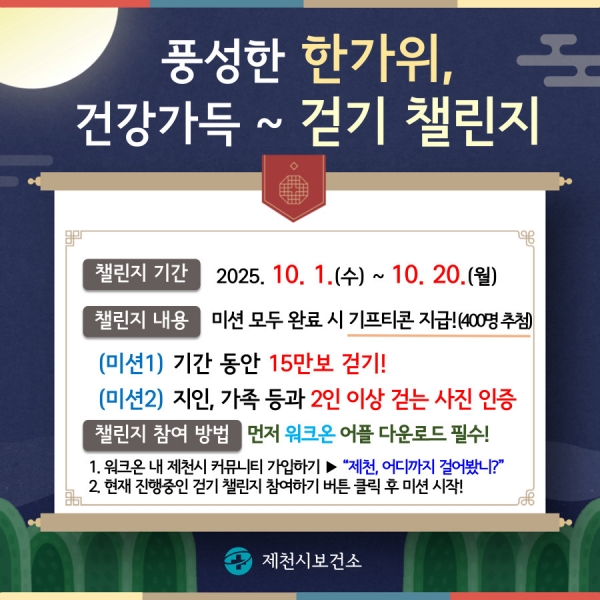 [세종타임즈] 제천시보건소는 추석 연휴를 맞아 시민의 걷기 실천을 돕기 위해 ‘풍성한 한가위, 건강가득 걷기 챌린지’를 운영한다.