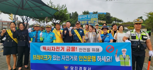 [세종타임즈] 당진경찰서는 25일 계성초등학교 사거리에서 픽시자전거 사고 예방을 위한 유관기관 합동 캠페인을 실시했다.