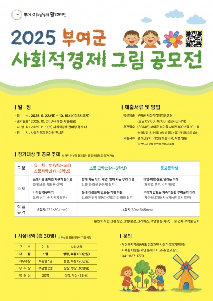 [세종타임즈] 부여군지역공동체활성화재단 사회적경제지원센터는 관내 어린이와 청소년을 대상으로 ‘2025 사회적경제 그림 공모전’을 개최한다고 밝혔다.