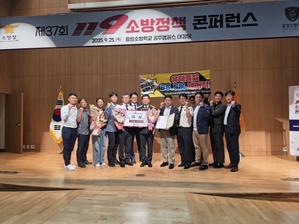 발표자로 나선 이산휘 부여소방서장은 ‘재난현장 유해인자 초기제거를 통한 통합관리체계 구축’을 주제로 Decon Nozzle의 현장적용 사례 및 과학적 검증을 제시한 연구결과로 심사위원들에게 실효성과 현장적응성에 대해 큰 호평을 얻었다.