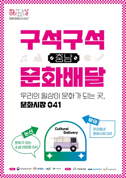 한편 ‘구석구석 문화배달’은 문화체육관광부와 충청남도, 논산시, 부여군이 주최하고 지역문화진흥원, 충남문화관광재단, 논산문화관광재단이 공동 주관하는 ‘문화가 있는 날’ 프로그램의 일환으로 추진되며 모든 프로그램은 무료로 참여할 수 있다.