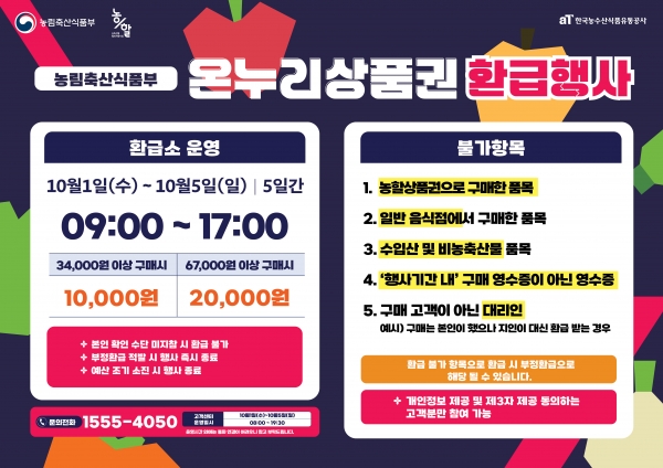 농림축산식품부가 주관하는 이번 행사는 행사 참여 전통시장에서 국산 신선 농축산물을 구매한 소비자에게 구매 금액의 최대 30%를 온누리상품권으로 환급하는 방식으로 운영된다.