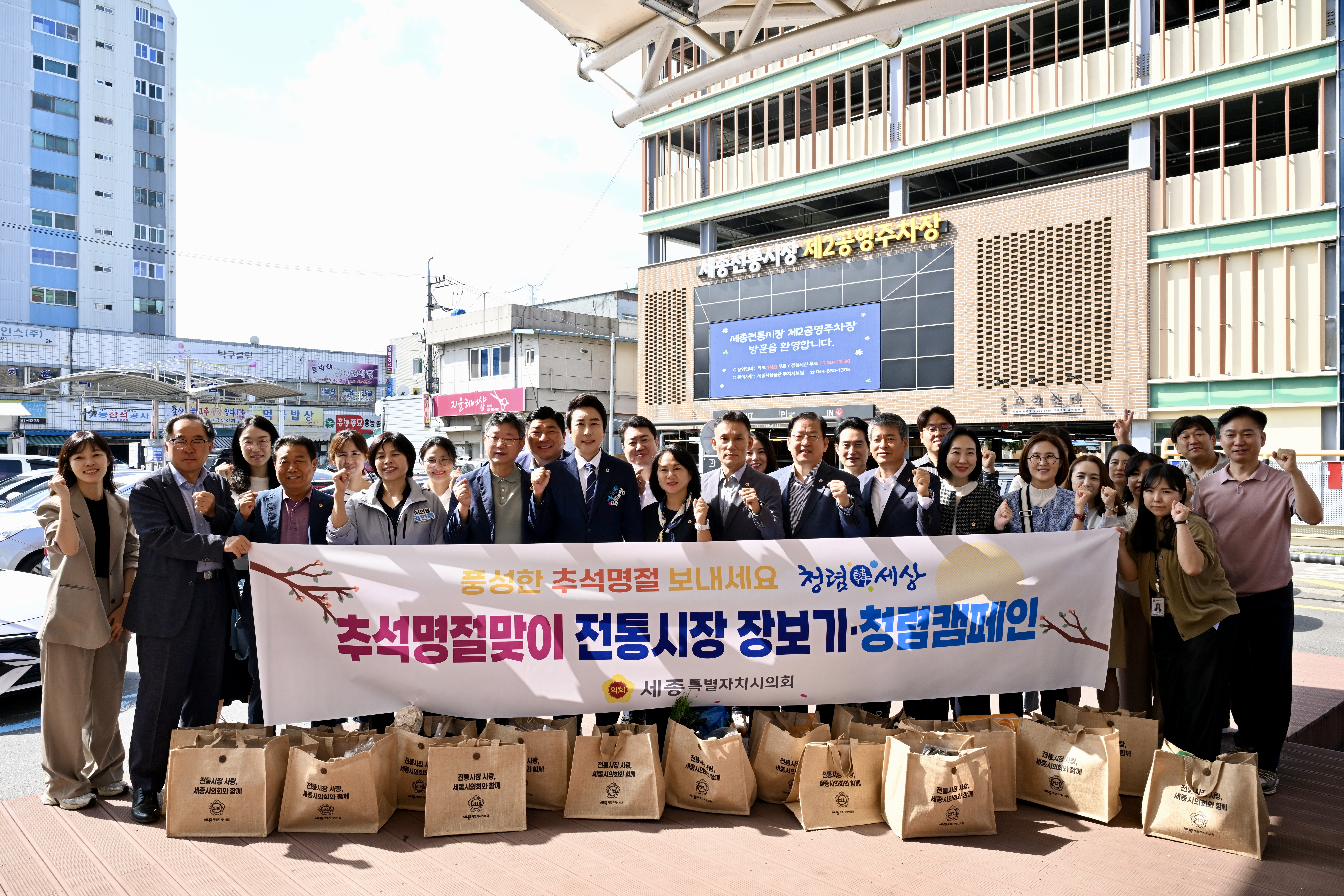 [세종타임즈] 세종특별자치시의회는 9월 29일 조치원 소재 세종전통시장과 대평시장을 찾아 추석맞이 장보기 행사를 진행하며, 지역경제 활성화와 청렴한 공직문화 조성을 위한 이중 행보에 나섰다.