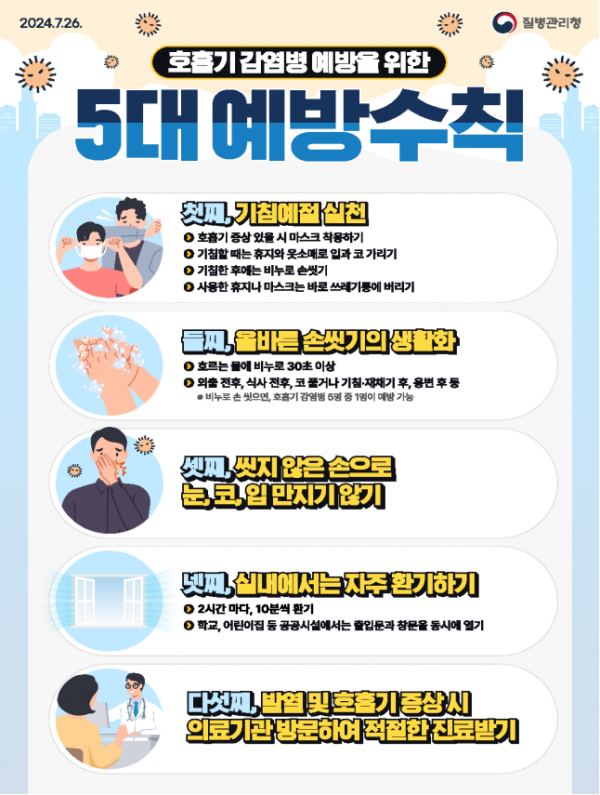 장기간의 추석 연휴 중 많은 이동과 친족간의 모임 등이 예상되는 만큼, 손씻기, 기침 및 재채기할 때는 옷소매로 입과 코를 가리기 등 호흡기감염병 예방 수칙에 더욱 주의를 기울이는 것이 필요하다.