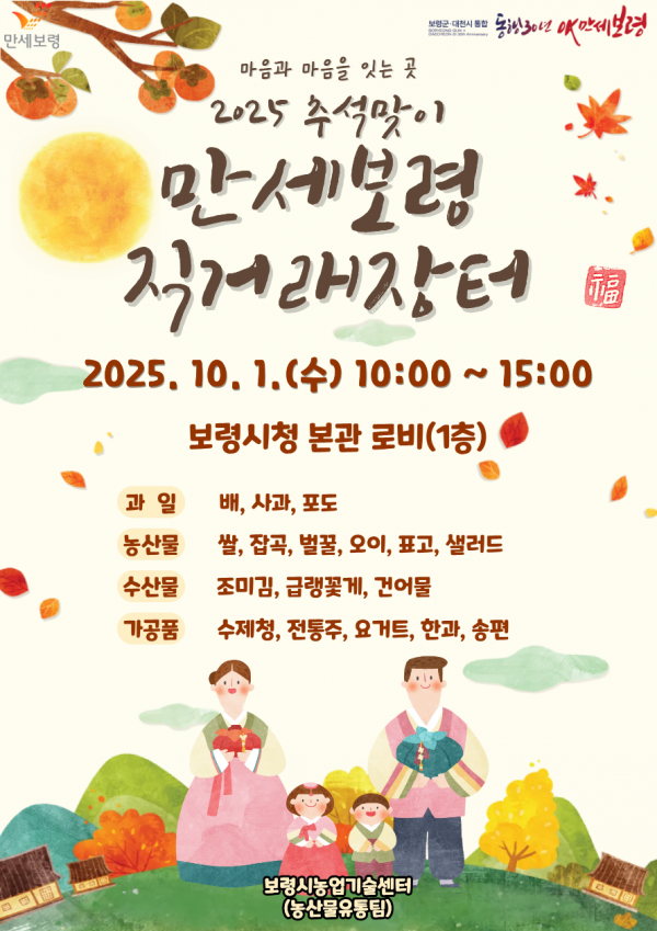 [세종타임즈] 보령시는 추석을 맞아 10월 1일 보령시청 본관 1층 로비에서 ‘2025 추석맞이 만세보령 농특산물 직거래장터’를 운영한다고 밝혔다.