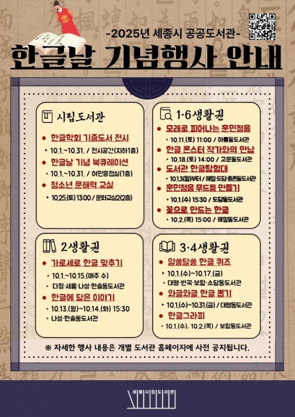 [세종타임즈] 세종시 공공도서관이 제579돌 한글날을 기념해 오는 10월 한 달간 한글의 소중함을 되새기고 한글을 즐겁게 체험할 수 있는 다양한 기념행사를 운영한다.