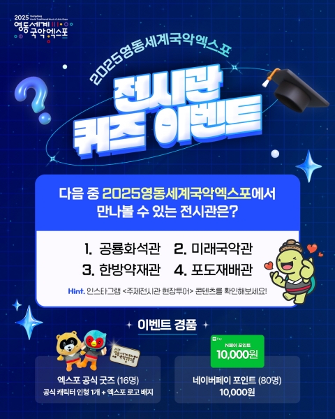 이번 이벤트는 2025영동세계국악엑스포에서만 만나볼 수 있는 3개의 주제전시관 중 하나의 이름을 맞히는 퀴즈 형식으로 ‘주제전시관 현장투어’ 콘텐츠에서 정답에 대한 힌트를 얻을 수 있다.