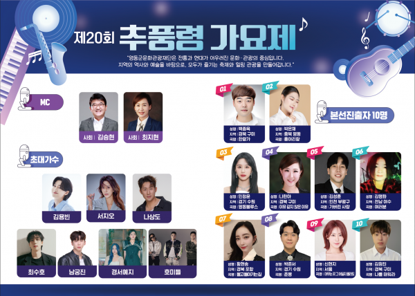 올해로 20회를 맞는 추풍령 가요제는 영동군과 영동군 문화관광재단, CJB 청주방송이 공동 주관하며 2025 영동세계국악엑스포 기간 중 특별 프로그램으로 마련된다.