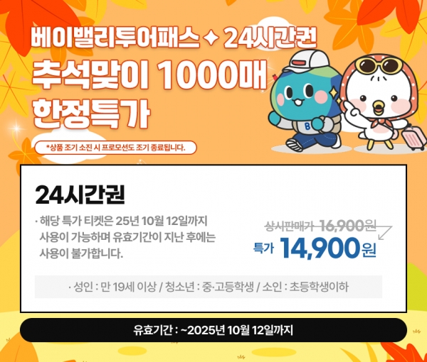 [세종타임즈] 충남문화관광재단은, 다가오는 추석에 충남을 방문하는 관광객들이 보다 편리하게 여행할 수 있도록 베이밸리 투어패스 추석맞이 특가 프로모션을 진행한다고 밝혔다.