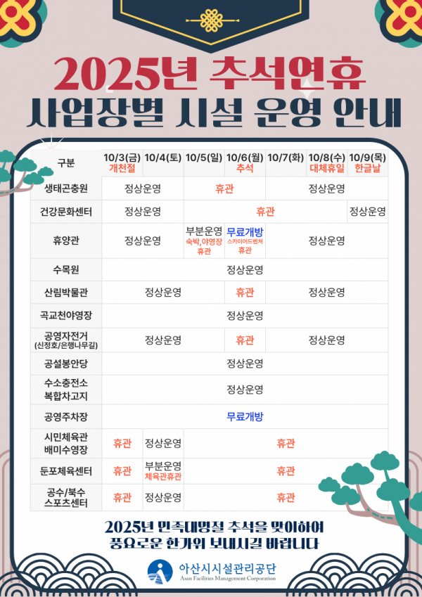 [세종타임즈] 아산시시설관리공단은 민족 대명절인 추석 연휴를 맞아 시민들이 안전하고 편안하게 공단 운영 시설물을 이용할 수 있도록 사업장별 운영 일정을 안내하고 연휴기간 중 안전관리에 만전을 기할 계획이다.