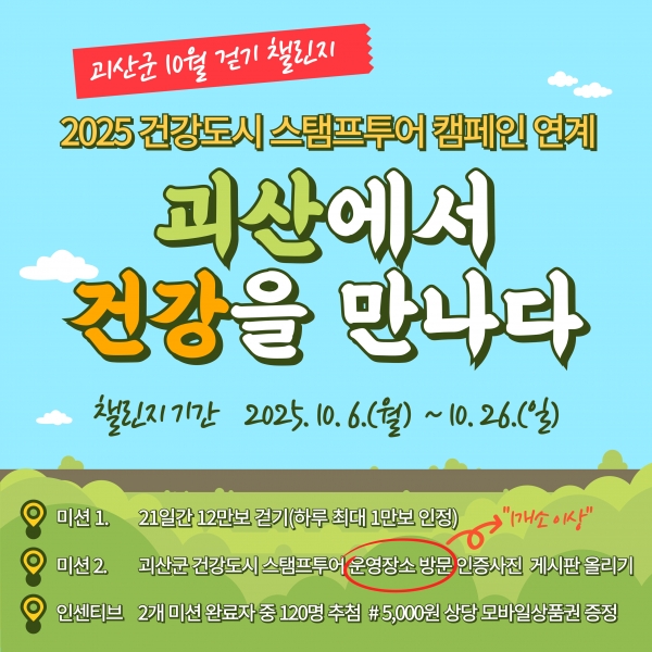 [세종타임즈] 충북 괴산군보건소는 한국건강증진개발원이 주관하는 ‘2025 건강도시 스탬프투어 캠페인’과 연계해 ‘괴산에서 건강을 만나다’ 걷기 챌린지를 운영한다고 2일 밝혔다.