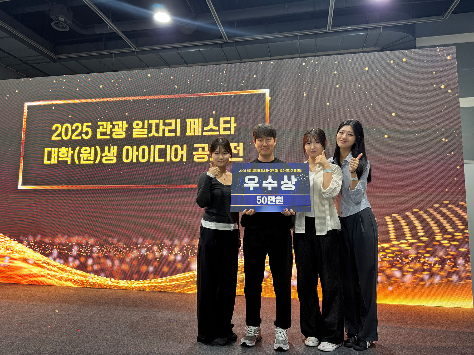 관광경영학과 장윤형, 김혜원, 송재윤 학생은 ‘잇다, 사람과 공간을 연결하다’라는 주제로 참가해 지역 유휴 공간과 관광 자원을 연계한 창의적인 일자리 창출 모델을 제시했다. 이들의 아이디어는 창의성과 실현 가능성에서 높은 평가를 받으며 우수상 수상작으로 선정됐다.