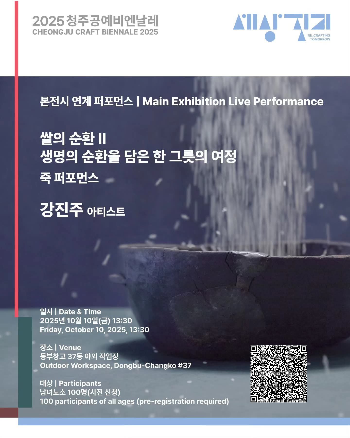 도예를 출발점으로 조각- 설치- 미디어 등 다채로운 장르를 넘나드는 이헌정과 함께하는 아티스트 토크는 오는 17일 오후 2시에 문화제조창 동부창고 38동에서 진행한다. 2025 청주공예비엔날레 준비한 마지막 국제공예워크숍의 자세한 일정 등은 홍보물을 참고하면 된다.