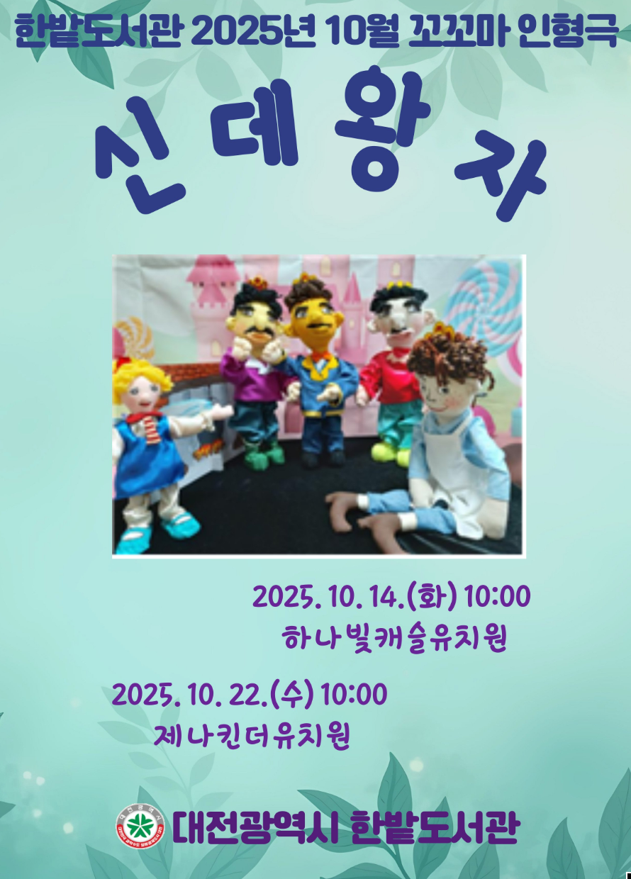 [세종타임즈] 대전 한밭도서관은 어린이의 감정 표현과 상상력을 키우기 위해 유치원을 직접 찾아가는 독서문화 프로그램으로 손인형극 ‘신데왕자’를 공연한다. 이번 손인형극은 10월 14일 중구 하나빛캐슬유치원, 10월 22일 서구 제나킨더유치원을 찾아 아이들과 만날 예정이다.