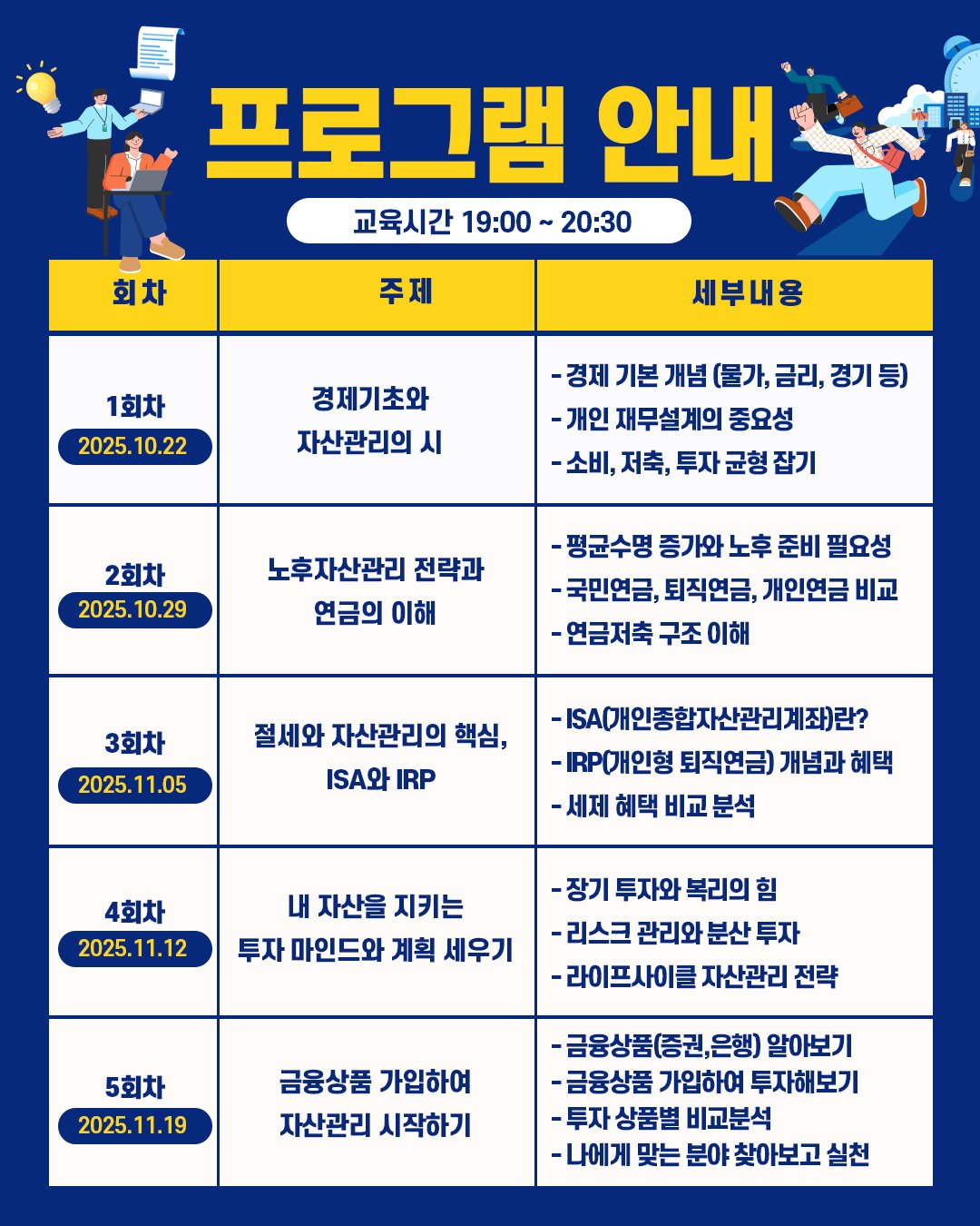 이번 프로그램은 “똑똑한 경제생활과 노후자산 관리”를 주제로 5회 과정으로 운영되며, ▲경제기초와 자산관리의 시작 ▲노후자산관리 전략과 연금의 이해 ▲절세와 자산관리의 핵심 ISA와 IRP ▲내 자산을 지키는 투자 마인드와 계획 세우기 ▲금융상품 가입을 통한 자산관리 시작하기 등의 내용으로 구성된다. 모집 인원은 20명 내외다.