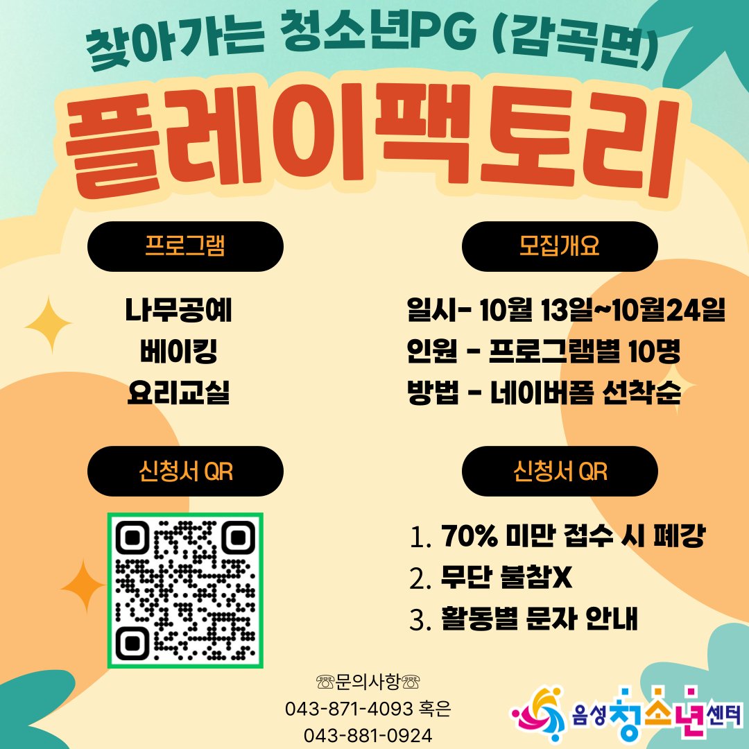접수는 이달 24일까지 포스터에 있는 QR코드를 통해 선착순으로 진행되며 찾아가는 청소년 프로그램 특성상 감곡면 거주자를 우선 모집할 예정이다.