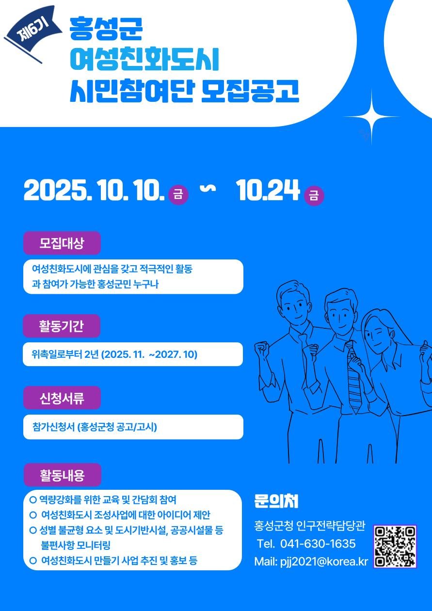 모집 기간은 오는 24일까지이며 홍성군에 거주하는 군민 중 양성평등과 여성친화도시에 관심 있는 사람이라면 누구나 지원할 수 있다.