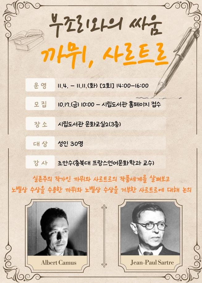 강연은 조만수 충북대학교 프랑스언어문화학과 교수가 맡아, 20세기 문학과 철학의 거장인 알베르 까뮈와 장 폴 사르트르의 작품세계를 탐구한다.