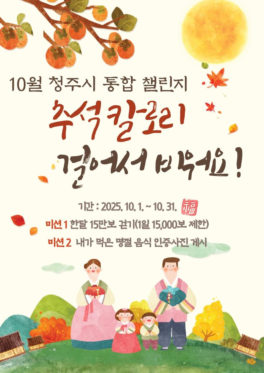 먼저 모바일 걷기 앱 ‘워크온(Walk-On)’을 활용해 청주시민 누구나 참여할 수 있는 ‘추석칼로리 걸어서 비워요’ 챌린지가 오는 31일까지 진행된다.